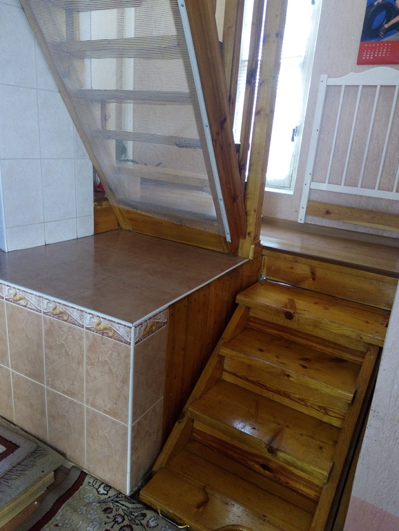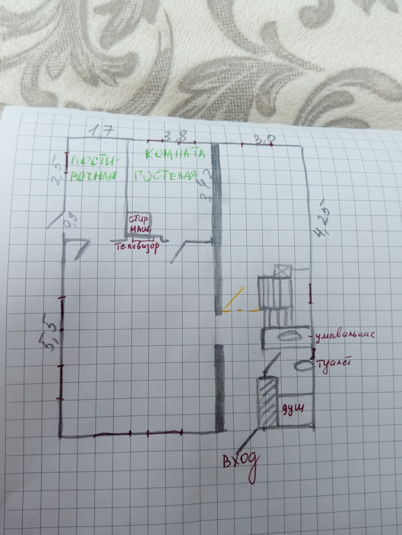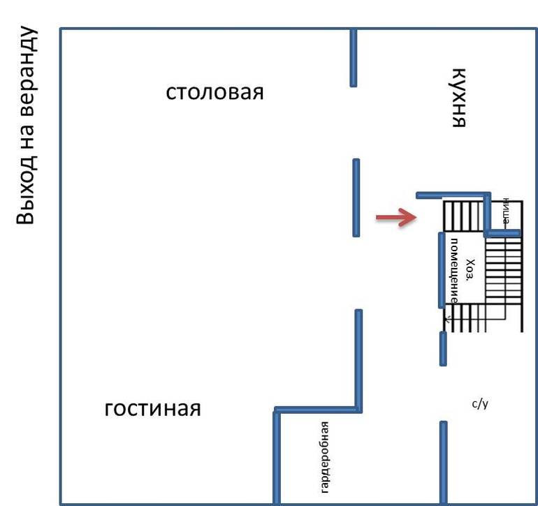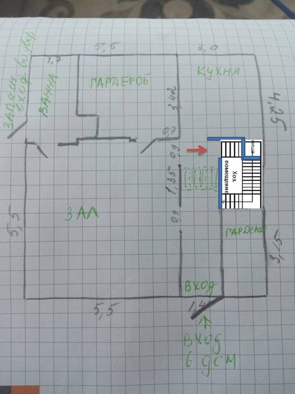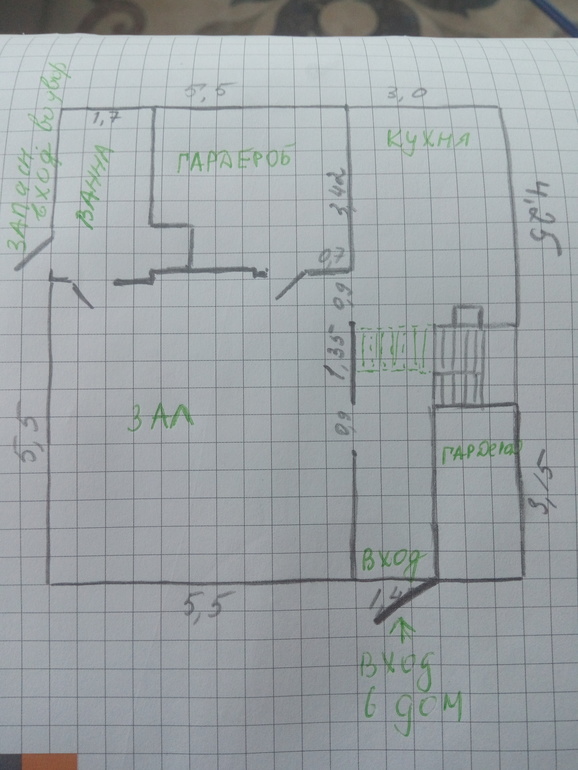 Дело в том ,что лестница очень крутая и в планах ее изменить(на фото зеленым отмечено,как хотим ее увеличить)но все упирается в то,что вход на кухню под лестницей становится не. удобным.Я решила сделать вход со стороны зала,а под новой лестницей сделать нишу под холодильники,но ,поставив так мебель,мне было не комфортно оббегать через зал .Я Всю голову сломала и лесницу решила не увеличивать в длину , а урезать балку ,там где гардероб при входе .Но тогда зачем проем в кухню из зала.короче люди добрые,кому не безразлично,натолкните на правилое решение.Да и еще все перегородки в части ,где кухня прихожая и лестница можно менять,а стена между залом и прихожей,кухней Несущая !!!! Спасибо