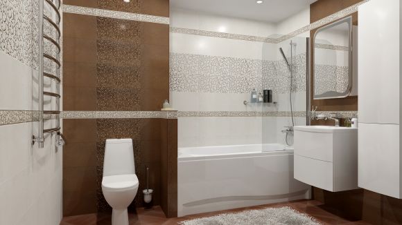 Перебор. Очень много всего. Я бы над ванной стену выложила декором белым, а все остальное помещение белой основной. Может над унитазом декором белым, если совмещенный санузел. Можно без бордюров. Коричневую не рассматриваю. На ней все пятна от воды видны будут.