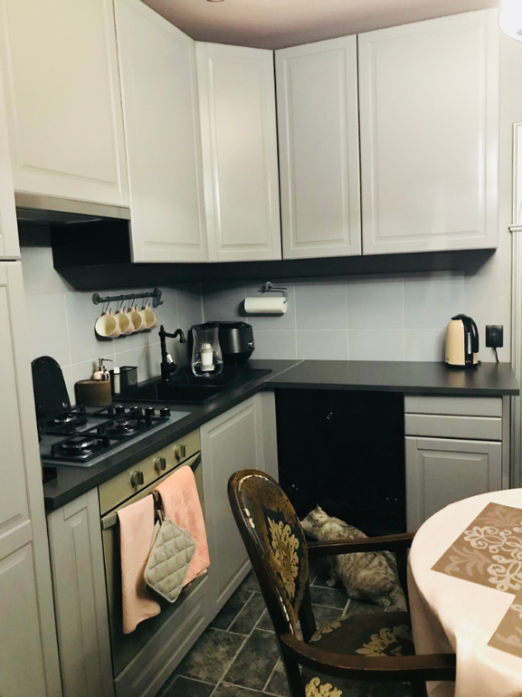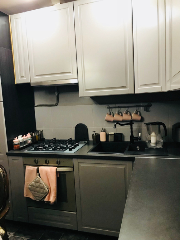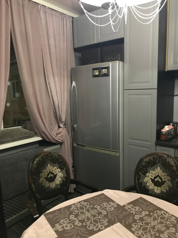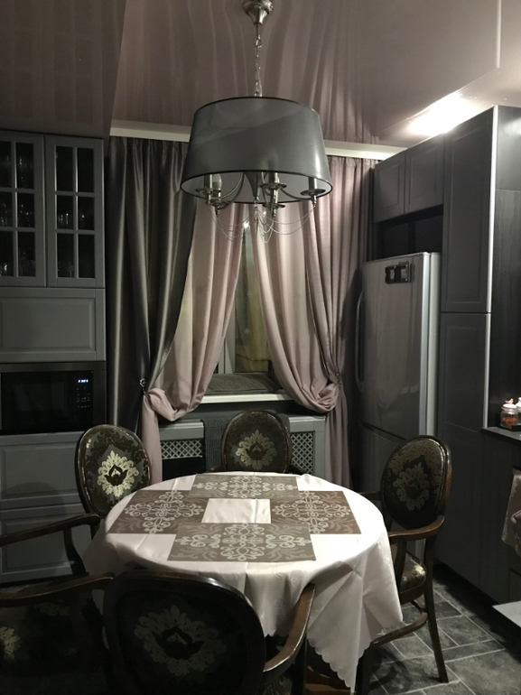 Конечно, еще куча недоделок: полочки, рамочки, ручки, накладные панели в щелку, фасад на ПММ, плинтуса и т.д., но это все мелочи. Как-то все само собой сложилось, и старый холодильник, который казался огромным (т.к. он 85 см. шириной), встал как там и был, и шторы лежали давно купленные зачем-то, и даже пудровый розовый потолок, который пугал своим цветом, очень даже вписался, хотя розового я и не планировала. Значит все случилось так, как должно было.