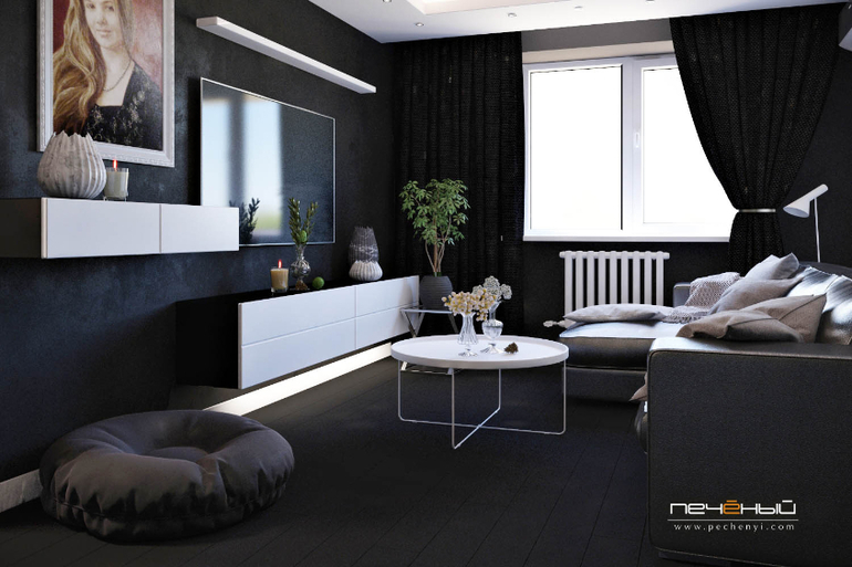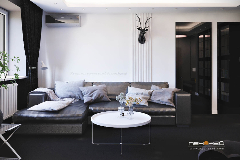 3. Куда ж без чёрного!)) Интерьер на любителя, правда? В такой гостиной как-то совсем сложно представить играющего ребёнка. Но как элемент можно взять идею с оформлением стены, на которой висит голова оленя.