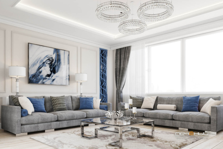1. Хороший пример того, как цвет влияет на восприятие интерьера. Синих деталей совсем немного, но без них явно было бы скучно)