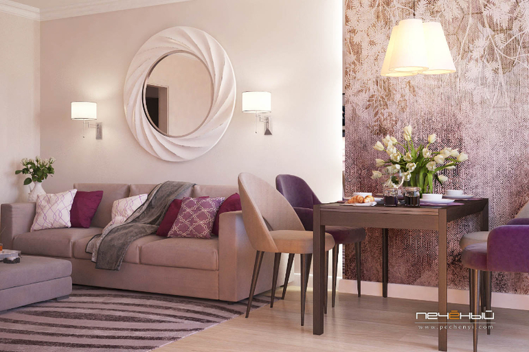 5. Напоследок - нежность и спокойствие. В этой гостиной выделена обеденная зона. Кстати, возьмите в качестве идеи оформление стены с телевизором - вокруг можно вешать крупного размера фото и принты)