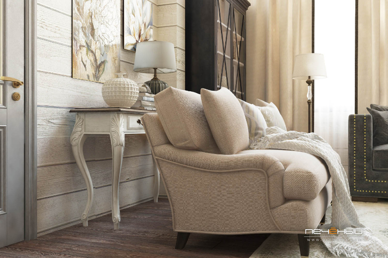 4. А вот интерьер поспокойнее, на контрасте с предыдущим)) Здесь необычно оформлены окна текстилем.