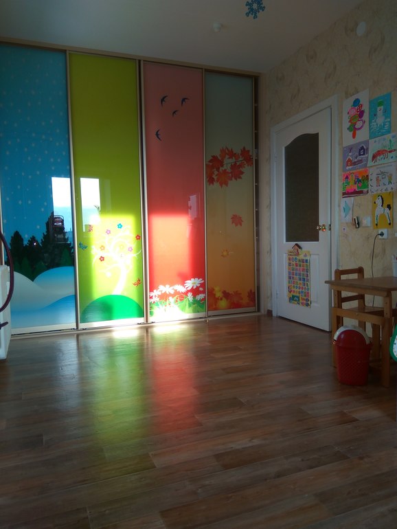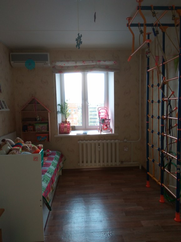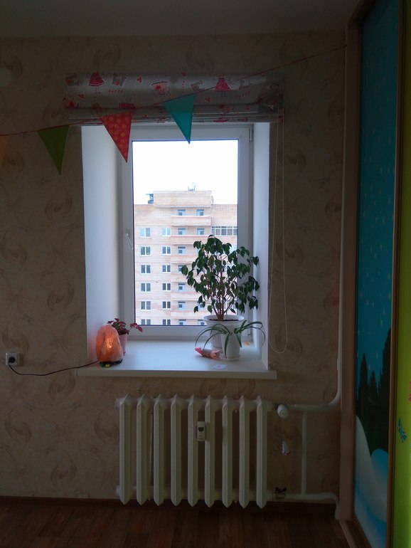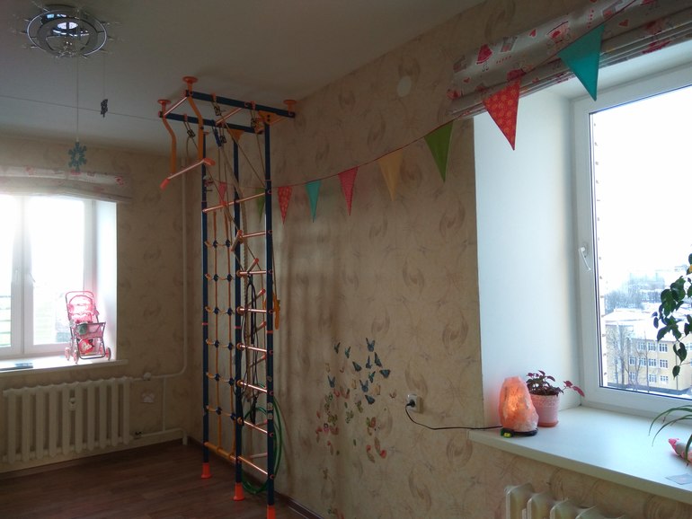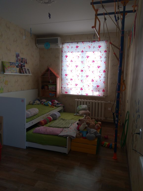Интерьерное решение детской комнатыДобрый день! Прошу совета, перерыла почти всю тему по интерьеру детской, но так и не придумала своего плана. Имеем: комната 15.66м2(длина 5.43, ширина 2.88), в комнате имеется 2 окна, шкаф купе во всю ширину, кровать выкатная для двух детей 2.05 метра длиной и 99 см шириной, шведская стенка. Когда мы заехали в данную квартиру под детскую была выделена самая большая и самая светлая комната(солнце весь день). Сразу же особо не думая я своим послебеременным мозгом сделала шкаф купе во всю стену. Теперь старшая дочь идет в школу и мы решили сделать ремонт. Я бы хотела сделать стол во всю стену (для двух детей), но думаю удобно ли это будет, т.к. в окно постоянно светит солнце. Также меня смущает, что подоконники у нас очень большие, не будет ли это смотреться громоздко, батареи чугунные и выпирают от стены на 20 см, чтобы уместить там батарею стол нужно делать широким? Спорткомплекс пока так же остается в комнате. Может быть кто-то подскажет как оптимально все разместить на данной площади, чтобы было удобно сразу двум детям 5 и 7 лет. На фото видно как у нас сейчас.