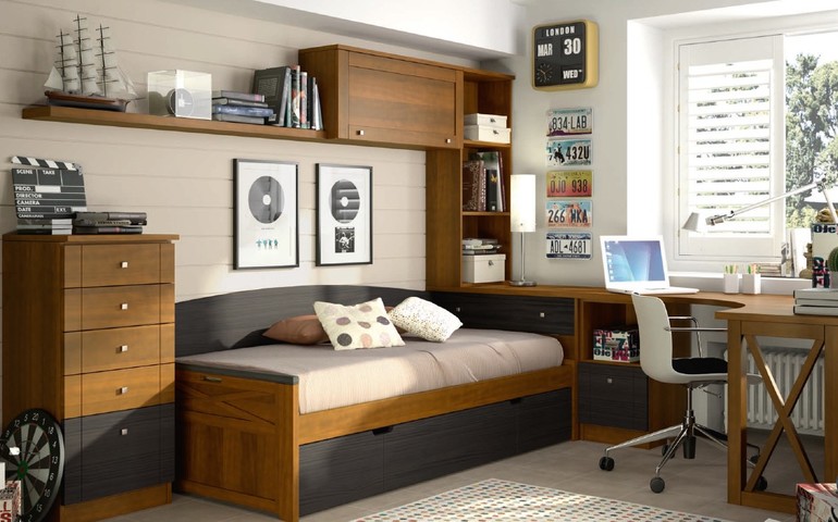 Там, где изголовье кровати, сделать тумбу для бельевых принадлежностей с откидной дверью. Вот так, примерно: