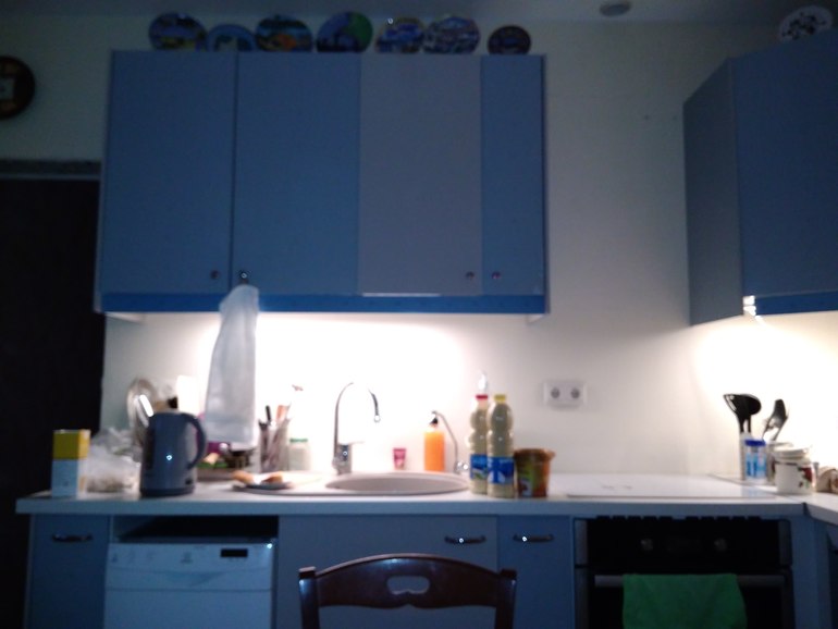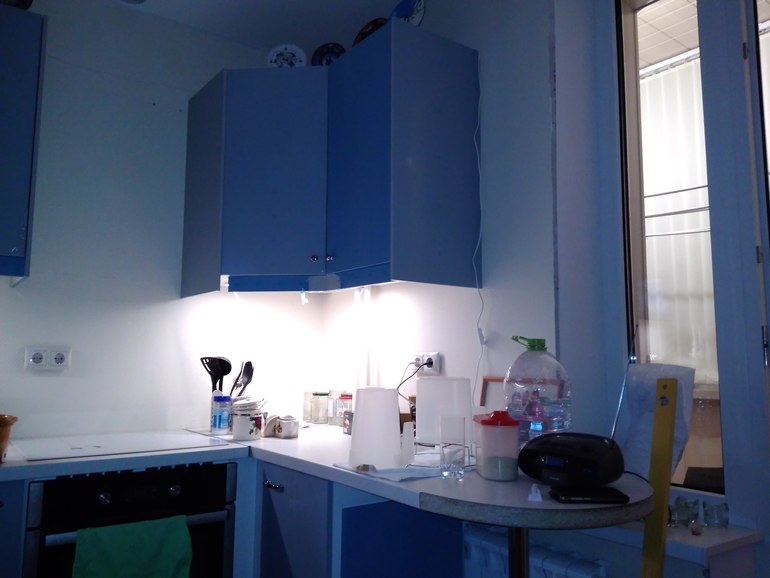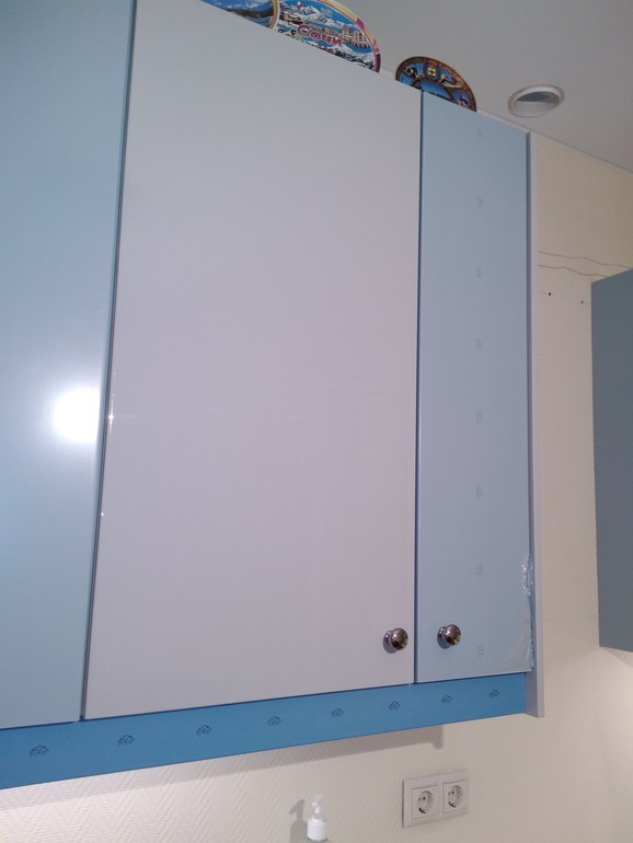 Сама кухня светло-серенькая, голубое это пленка ещё не снята с фасадов.