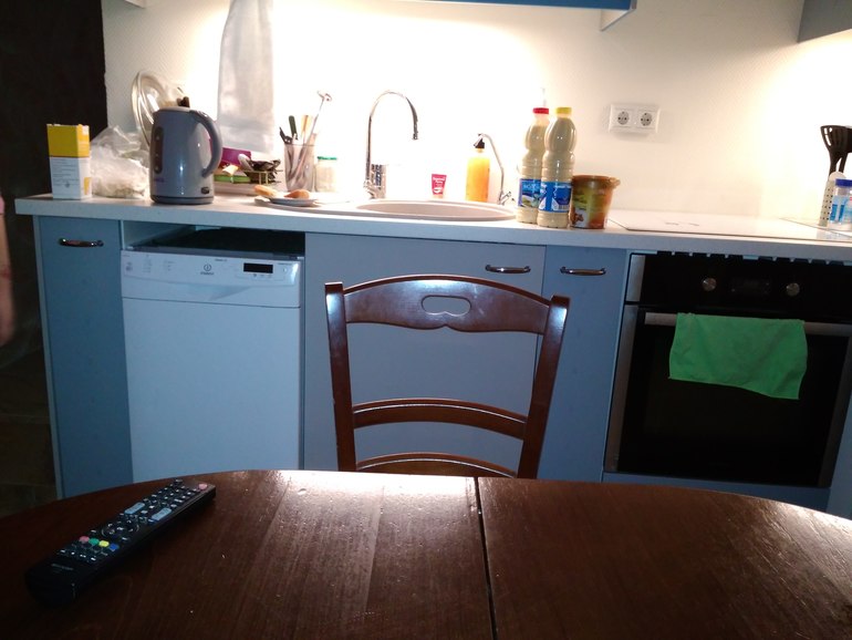 Стул и стол темного цвета это от предыдущей кухни , она была в стиле кантри.