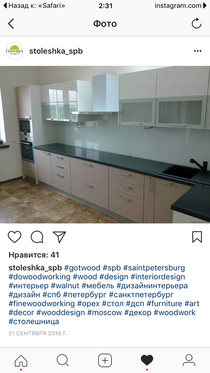 Спасибо, купила белую глянцевую столешку, смотрю теперь чёрную Мойку и выбираю фартук)