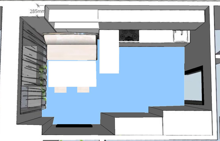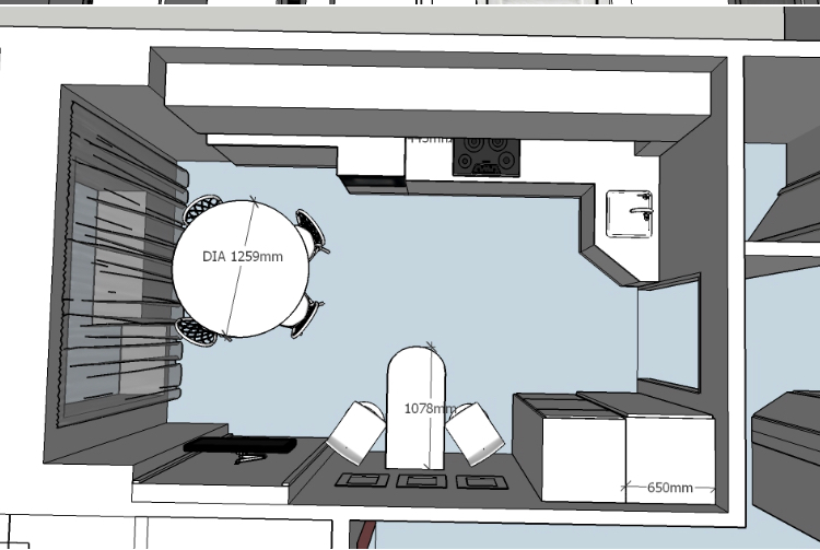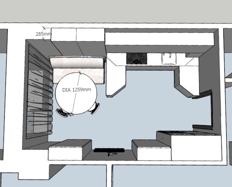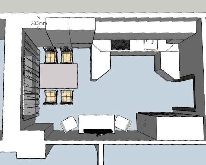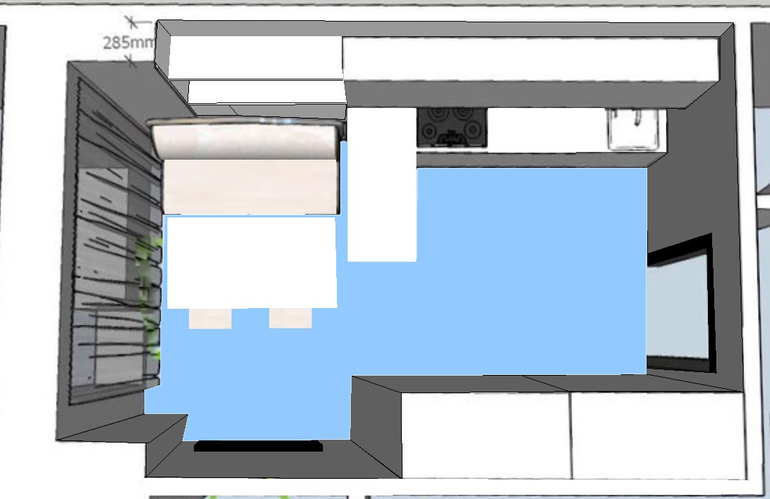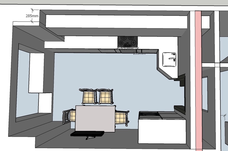 Да, там получается телик прямо над столом(( дизайнер утверждает что рабочей поверхности с плитой и мойкой должно быть не менее 3,5 метров. Не знаю как я помещалась в старой квартире на полуторах.
