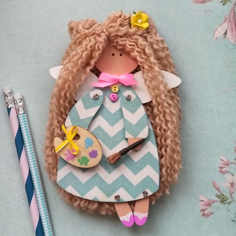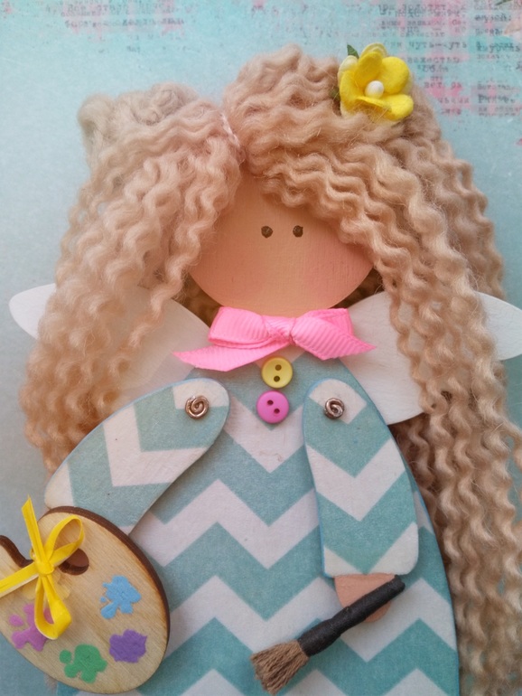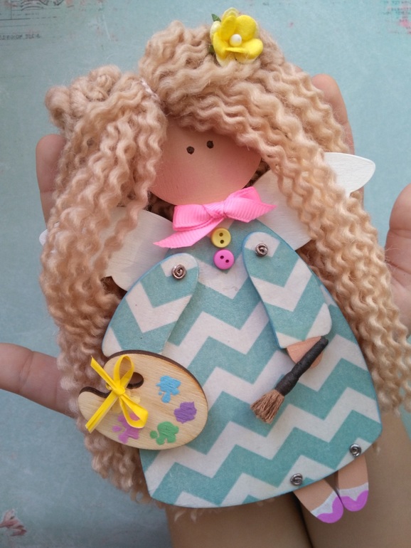 Интерьерные штучки.Утром последнего зимнего дня этого года по радую ваши глазки-полным ходом у меня идет подготовка к весенним праздникам. Готова куколка-художница для украшения детской девочки, увлеченной изобразительным искусством. Можно подвесить за петельку, а можно играть-ручки и ножки Ангела подвижны.