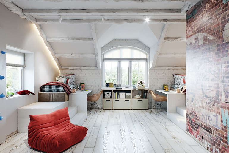 Ловите комнату с элементами шале. Интерьер разрабатывала для двух мальчиков-близнецов.