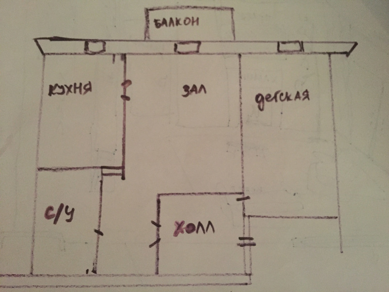 Перепланировки стен. Согласование перепланировки квартир и нежилых помещений.Девочки, помогите, плиз)) Всю голову сломала уже.. как сделать перепланировку с такими данными в сталинке максимально удобной? планируем сделать небольшой квадратный коридор, с захватом дальней комнаты(детской), чтобы сделать зал непроходным. Из коридора входим в зал, из зала распашные двери на кухню в стене между залом и кухней. Кухню сдвигаем немного, забирая пространство из туалета. Ванную объединяем с туалетом. В закутке( где был проход на кухню) ставим систему хранения. Смущает, что вход в санузел как бы из зала получается..