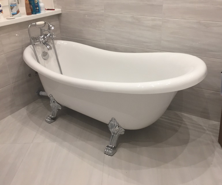 Пока ещё не задекорировали слив в канализацию, потому что решение поставить такую ванну пришло в последний момент, а все выводы уже были сделаны и лежала плитка. По-хорошему, слив должен быть в пол. Ну и подоконник пока вместо полочки🙈