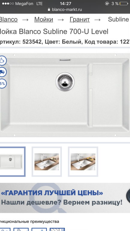 У меня мойка Blanco sublime 700-u level, пользуюсь уже два года. Для меня - очень удобна, глубокая и большая. Корзина для посуды (корзина) тоже удобная. Также рекомендую смесители Blanco, их можно купить в цвет мойки.
