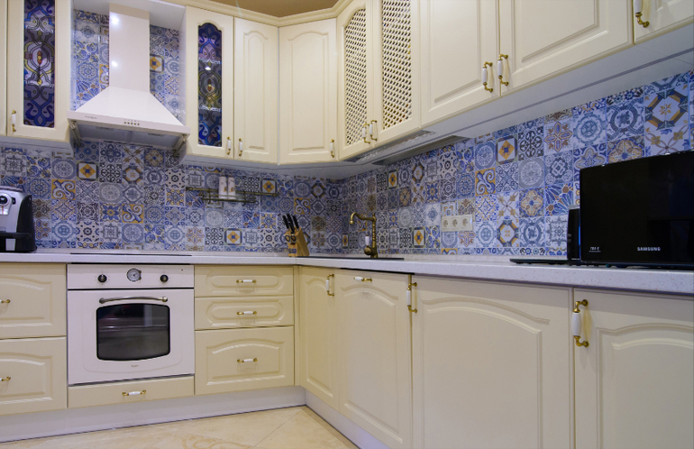 Не нравится сочетание фасадов кухонного гарнитура и плитки. Рельефная стена в спальне выглядит старомодно и очень странно. Дизайна не увидела.