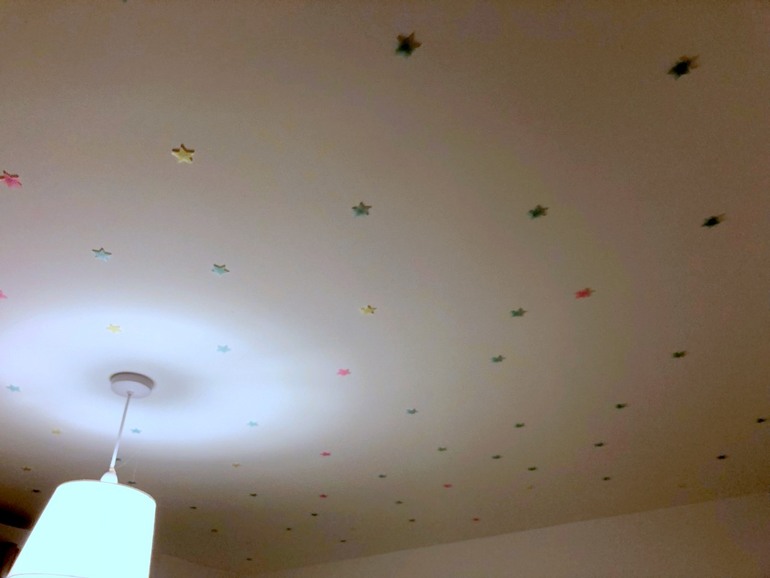Ну и еще я приклеила сетязиеся в темноте звездочки на потолок. Переживала что дочка будет бояться, но они слабенько светят так что в самый раз.