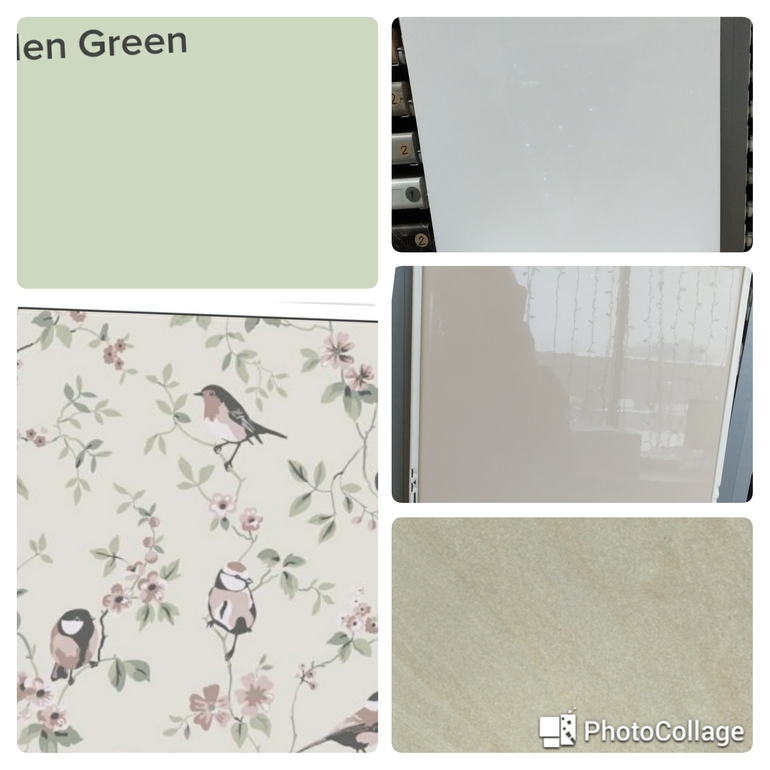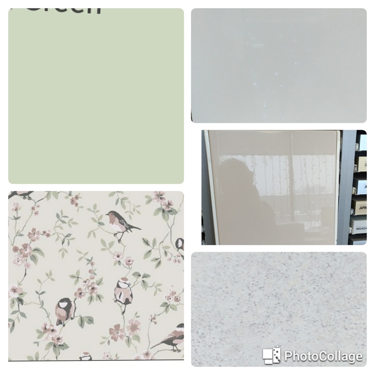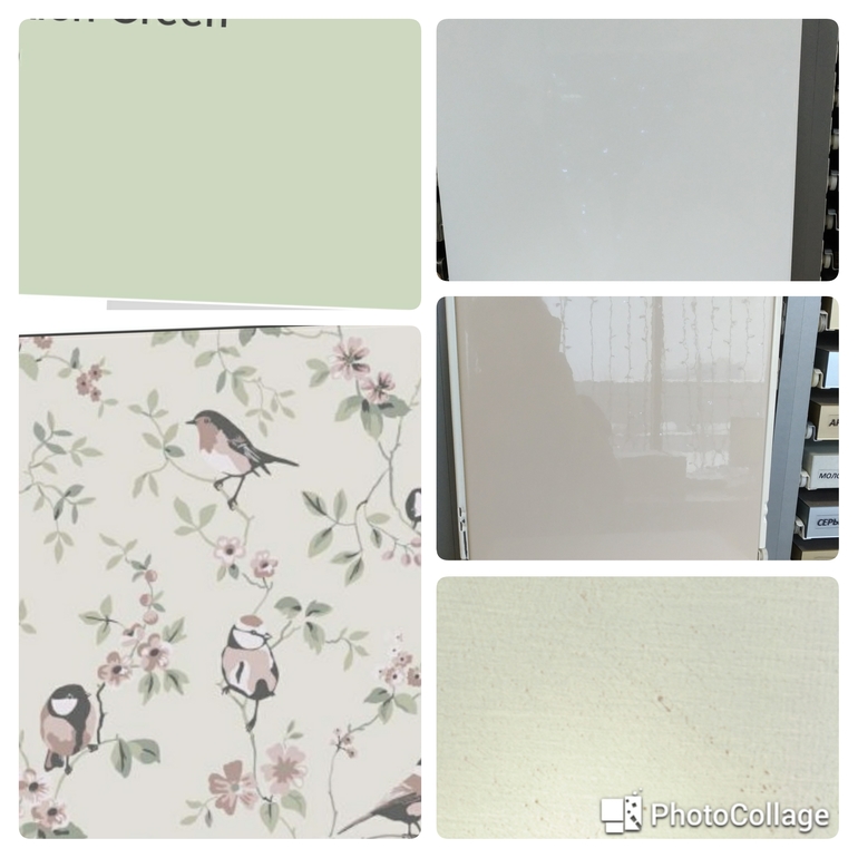 Интерьерное решение кухниДевочки, помогите плиз, подобрать столешницу! Хотела под мрамор, но техническим причинам, нужно делать столешницу из материала egger, Обои, краска для стен, фартук уже куплены, не могу подобрать столешетцу((Слева вверху цвет стен, ниже с птичками акцентные обои. Правее фасады- белый глянец и кофе с молоком, внизу справа- предполагаемые столешницыСпасибо
