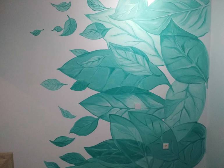 Сначала думала сделать бирюзовыми шторы в один из оттенков на листиках, но сейчас , наверно, придется уйти в цвет морской волны, чтобы перекликалась с голубыми стенами.. Думаю, такими оттенками росписи: