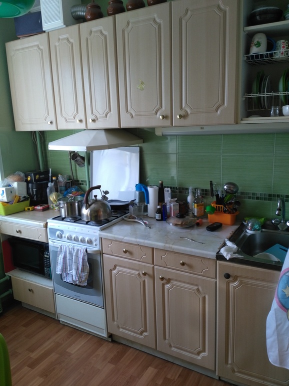 Против белого ничего не имею,но зеленый фартук,линолеум под ламинат и белая кухня както не айс мне кажется