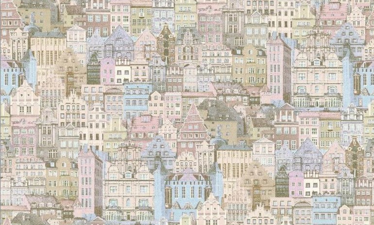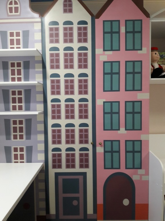 Мне очень понравились обои и я решила развить эту тему в интерьере детской. Сделать, как бы, маленький городок в таком стиле. Пол был выбран подобным плитке на мощеных улочках, домики тоже нашли свое место.)