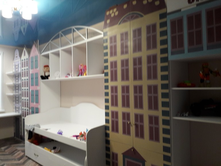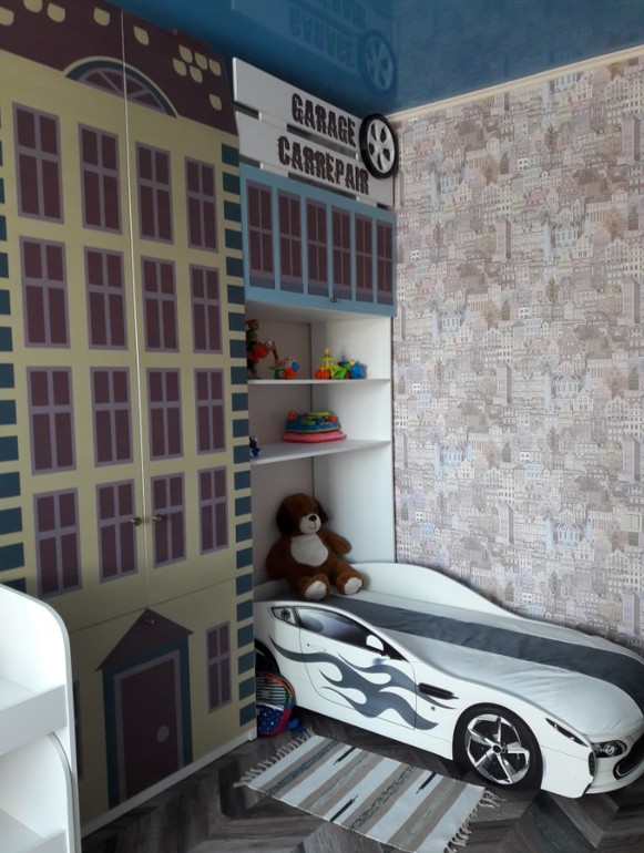 В шкафах-домиках одежда и постельные принадлежности. Кровать-диванчик с выкатным спальным местом. И "машина" стоит в "гараже". В стеллажах и шкафах напротив книги, игрушки и пр. Над комодом я планировала грифельную доску, но заказчики повесили зеркало.