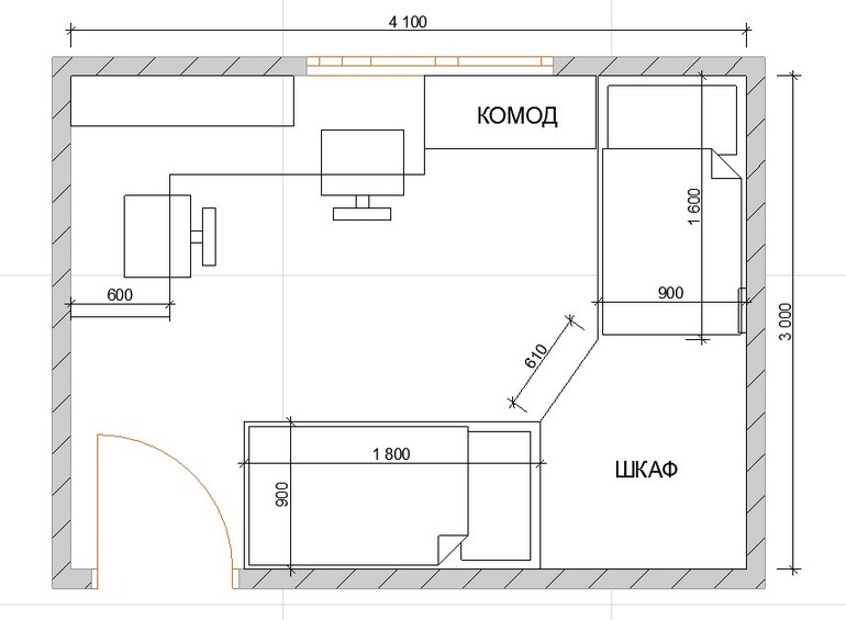 Кровать, которая имеется встанет справа от двери, - для старшего, затем угловой шкаф и двухъярусная кровать для малых). Длина кровати обусловлена шириной двери шкафа. Их надо будет приобретать. И столешницу для стола и полки над ним. И все равно, места для игр почти нет((. А им хорошо бы спортивный комплекс; с ума сойти, 3 мальчика!))
