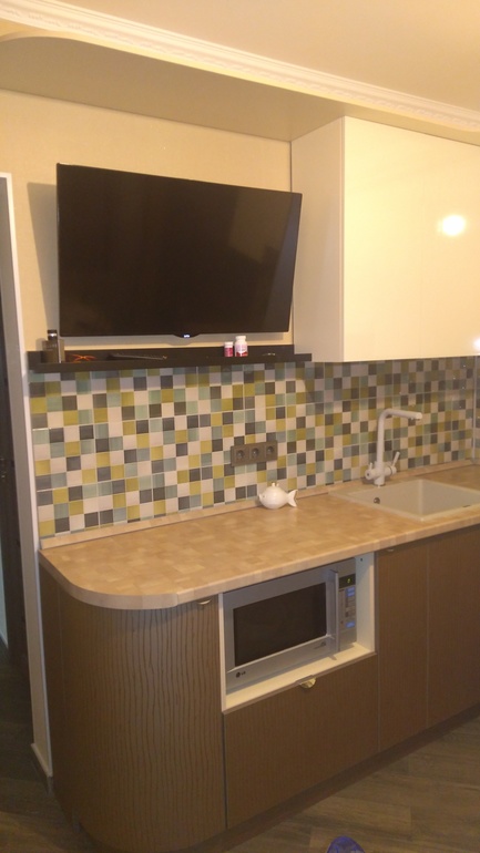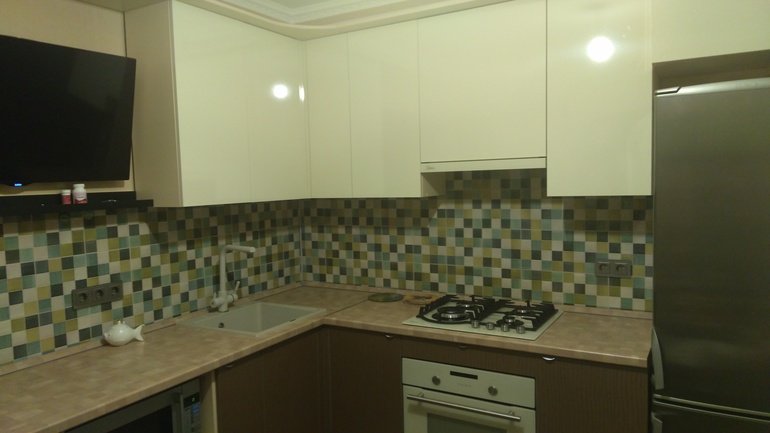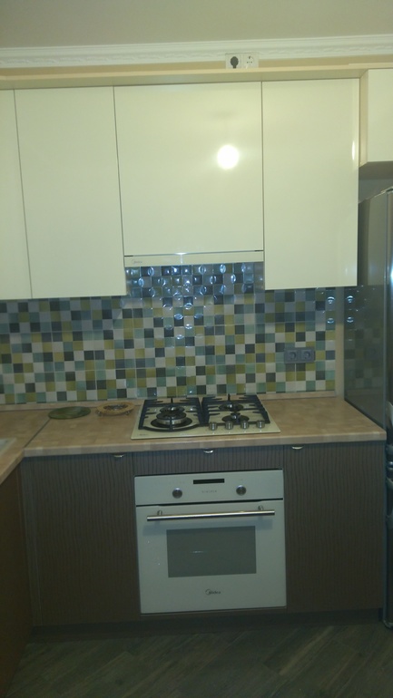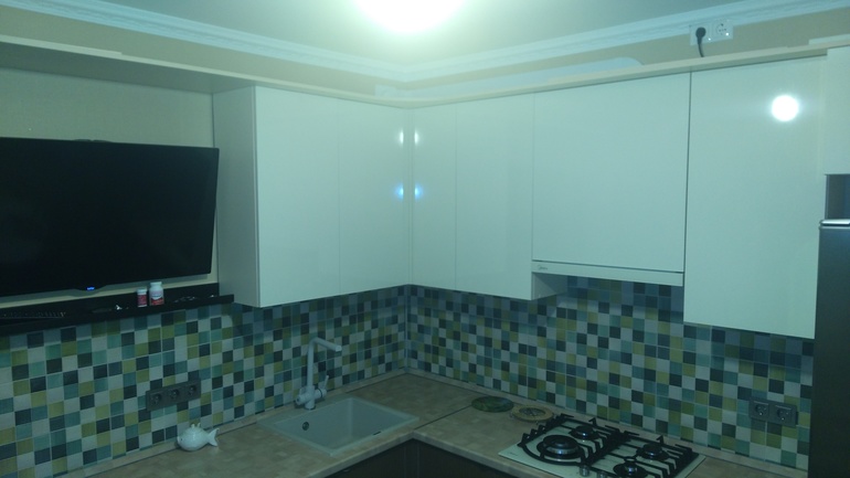 над шкафами прямоугольная. Вот здесь видно. У нас газовая труба по всей кухне ещё проходит, начинается от дверного проёма и по двум стенам. Это основная проблема была ( ( Делали шкафы не стандарт 84 и козырьком ещё на ТВ прятали. Либо надо было все шкафы пилить.