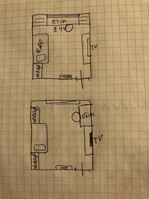 не понятно что это полосатенькое слева от входа) но первый вариант, конечно, круче. И шкаф можно поставить большой и слева от входа по этой стене. Тем более, если двое будут там жить. Я бы не делала на вашем месте под ТВ никаких тумб сложных, потом можно будет туда вторую кровать поставить.