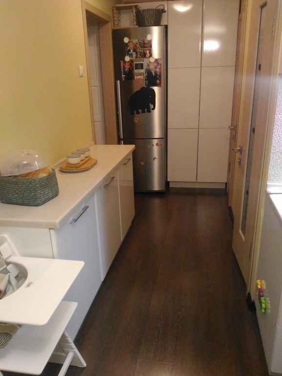 У нас такая же. Мы убрали простенок при входе в кухню и шкафы сделали по этой правой стене. Появилось и место для хранения, и столешница