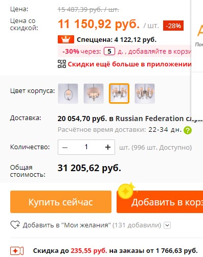 Заказала на Али 4 люстры. Вышли все вместе на 29тыс. Видила в Москве в магазинах точно такие же от 20 тыс за штуку. Пришли все быстро транспортной компанией, упакованы хорошо, работают, качество хорошее.