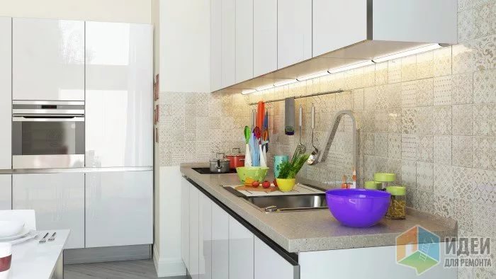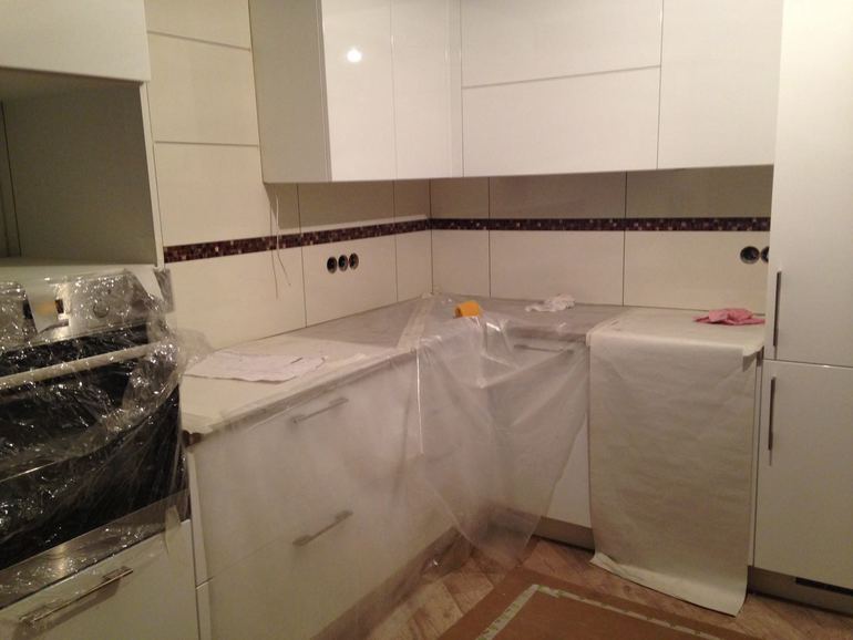 кухня белая, фартук айвори (недорогая российская Керлай, Стелла) + дорогая акцентая мозаика (ее немного, поэтому вполне укладывается в бюджет)