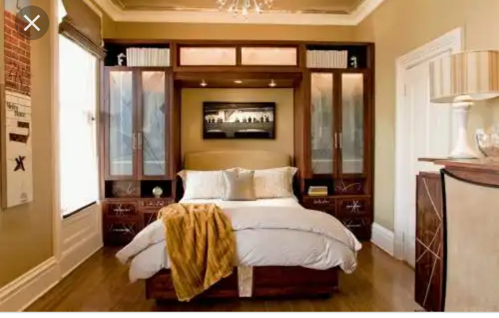 Место для шитья у окна, место для работы мужу-у входа, по одной стене- диван с сервантом, стол раскладной какой-то в оставшееся пространство