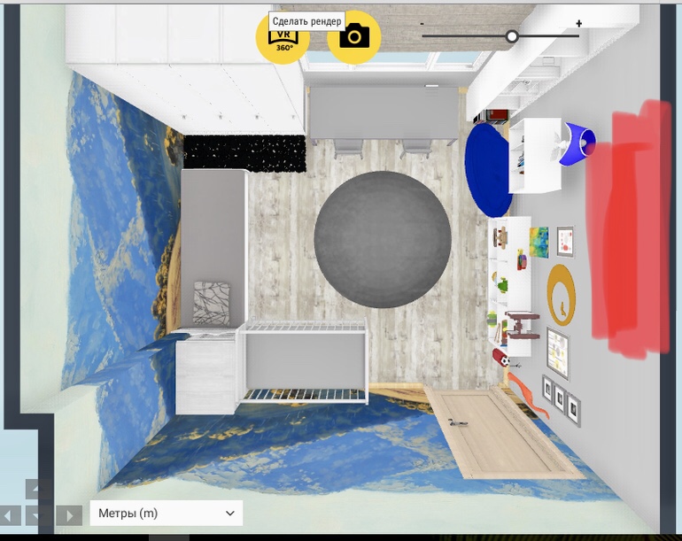 Комната примерно 3,84м x 3,89м. Стена, по которой нужно разместить полотно, выделена красным: