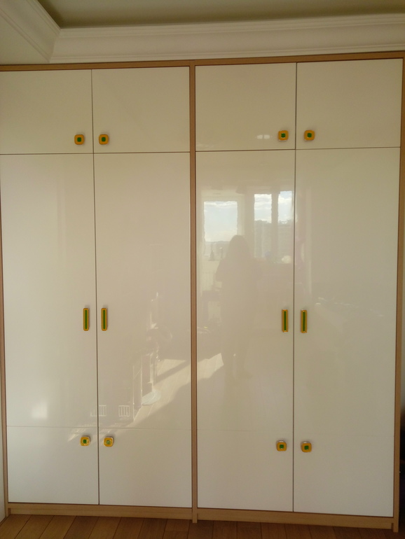 Просто белые глянцевые дверцы. У нас в спальне комбинация глянцевых и зеркальных. Ширина этого шкафа 1 метр