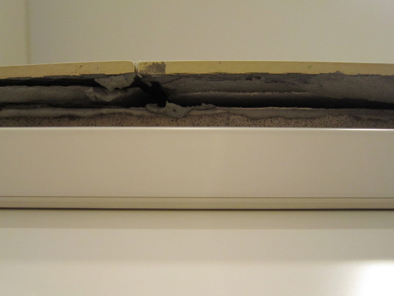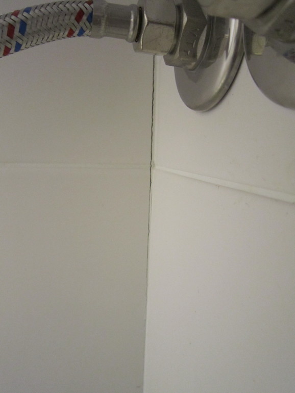 Теперь нужно снимать натяжной потолок и заново класть плитку над дверью. это еще траты.. Обратите внимание на затирку, все углы с трещинах, затирка потрескалась почти везде в туалете.