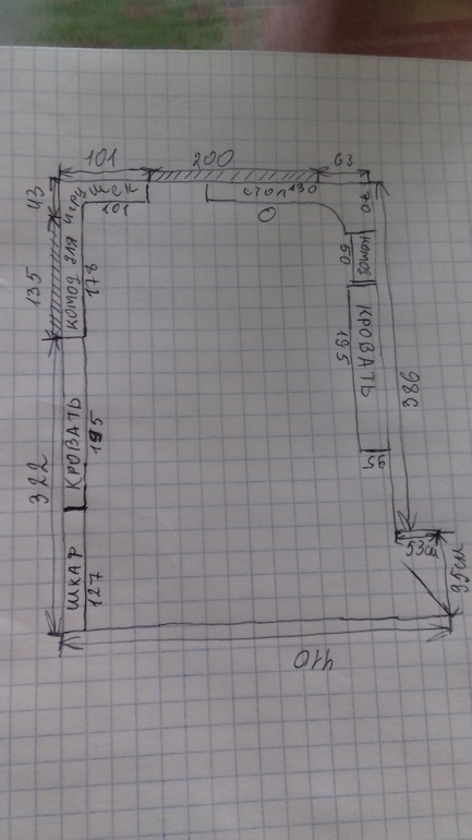 Вы в масштабе нарисуйте. Например, 1 м это 4 клеточки. И ширину шкафов-кроватей тоже. А то получается что у вас лавочки одни и куча свободного места)