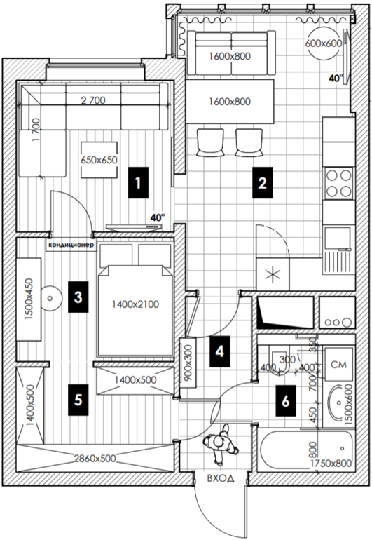 Вот и план квартиры, наглядно демонстрирующий, как из однушки сделать двушку. Возле спальни - вместительная гардеробная, в которой прячутся все вещи, в том числе и верхняя одежда. Благодаря этой комнате удалось не перегружать гостиную и спальню лишними деталями - комодами, полками и стеллажами, не говоря уже о шкафах, которые попросту некуда было бы поставить. :)