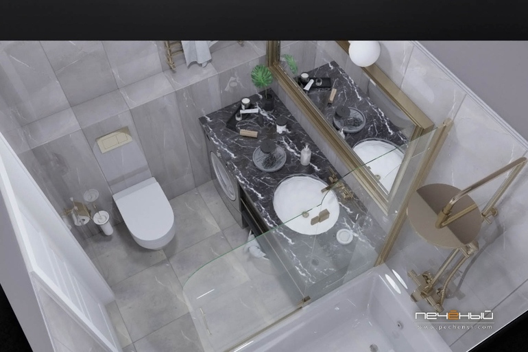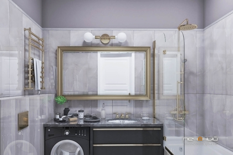 Сантехника золотого цвета выглядит очень необычно, но, как всё необычное, стоит дороже. :) Санузел редко входит в дизайн-проект, однако здесь заказчики решили не экономить на визуализации. Здесь нет каких-то невероятных дизайнерских решений, могу только обратить внимание на идею с тем, как можно изящно вписать стиральную машину под столешницу с умывальником. Главный секрет в том, чтобы стиралка и мебель были одинакового цвета.