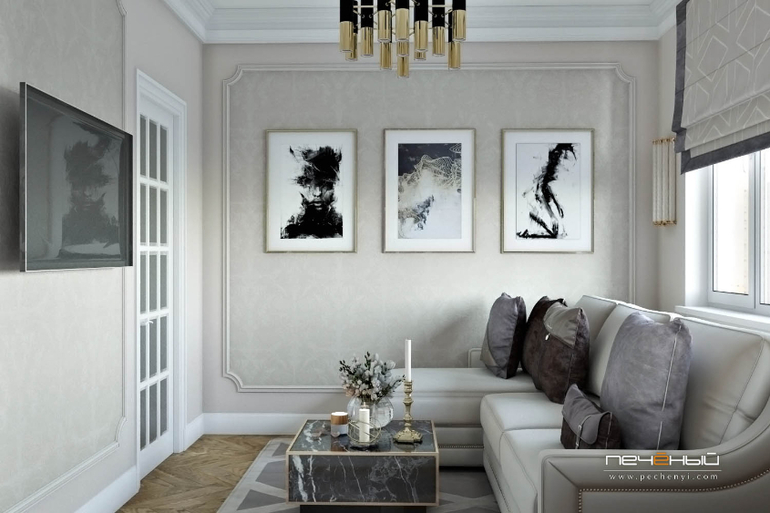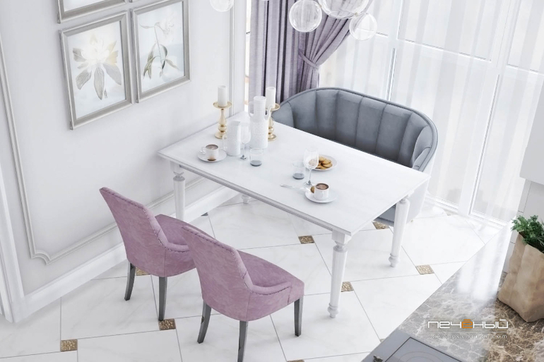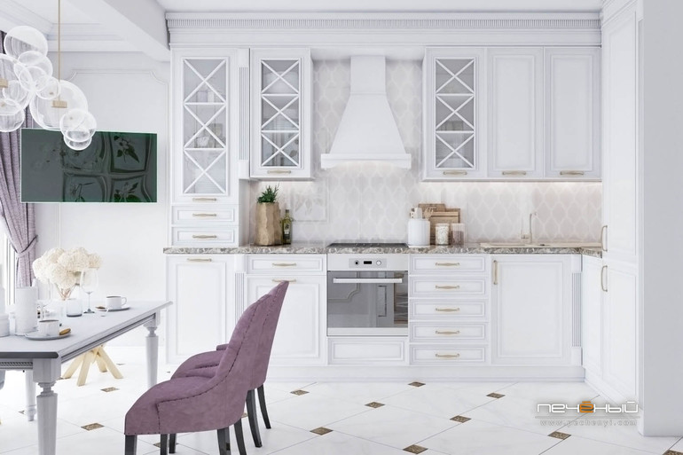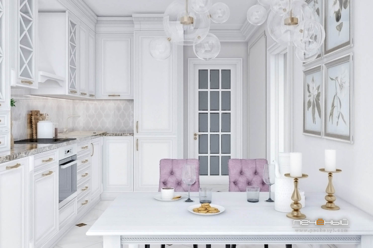 Обычно мы стараемся оттенить чем-то белые фасады - ярким фартуком или стенами. Но здесь решили сделать всё белым: хотелось подчеркнуть воздушность интерьера, добавить простора. Светлая кухня не выглядит скучной и блёклой, потому что глазу есть за что зацепиться. Тут притягивают внимание молдинги на кухонных шкафчиках и стенах, золотистая фурнитура, плитка на полу, цветные мягкие стулья и цветочные принты в рамах в столовой зоне - пусть все эти детали не яркие, но они в совокупности делают интерьер кухни очень интересным и насыщенным.