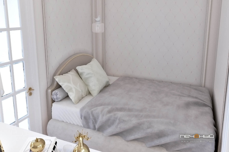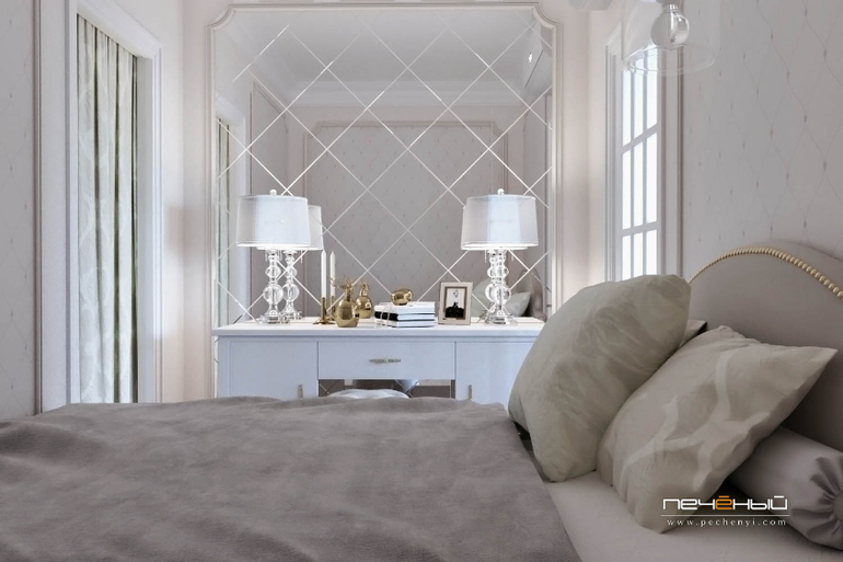 Это - вся спальня, да. Такая малютка размером с кровать. :) Зато отдельная! Чтобы расширить визуально пространство, мы сделали одну стену зеркальной - ту, что за туалетным столиком. Я знаю, есть люди, которым не понравилось бы спать напротив зеркала, но у заказчицы, к счастью, на этот счёт предубеждений нет. Слева, за шторкой, находится большая гардеробная.
