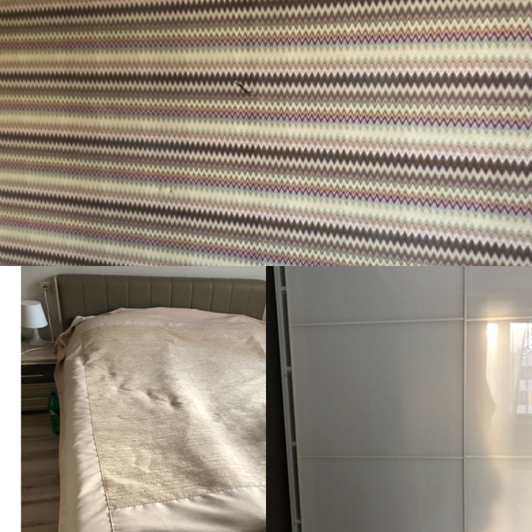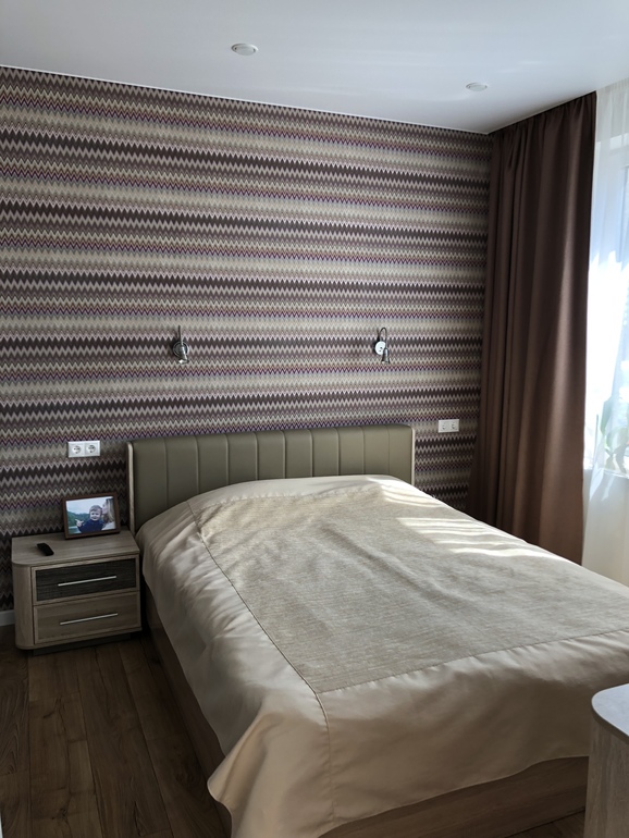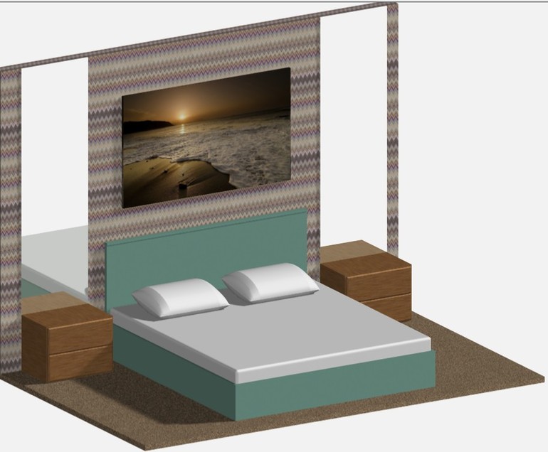 Интерьерное решение жилых помещений.Девочки все совсем плохо да?? Поклели мне мои сирпи от котрых мы с мужем протащились на образце в магазине, и я готова рыдать(((( эти зиг заги... от них болят глаза.... и кажется что они двигаются)) рабочий выпил 3 таблетки обезболивающего пока клеил.... как их можно обиграть?! Коллаж прикладываю какая будет кровать и шкаф..... остальные стены светлые бежево серые чтоль....