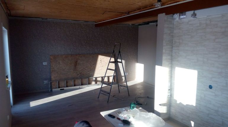 Интерьерное решение жилых помещений.Добрый день. Делаем ремонт в доме. В кухне-гостиной наклеили обои в бежево-коричневой гамме. Помогите, пожалуйста, определиться с цветами кухни, штор, дивана.. Не хочется и мебель всю делать в этих цветаз, хочется ярких акцентов, но очень боюсь ошибиться. Нравятся цвета синий, фиолетовый, лавандовый, бирюзовый, фисташковый. Но как это сочетать не знаю. Сейчас надо заказывать кухню. Сначала хотела всю белую, но сейчас хочу белый верх и другой низ, но какой?? Муж всю белую кухню не хочет. И опять же шторы, диван какого цвета? Девочки, может посоветуете что-то. Это вид из кухни.
