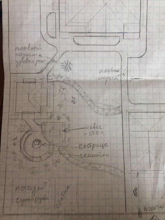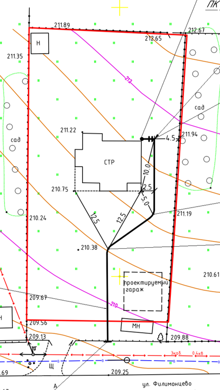 Стороны света: наверху север, внизу, где дорога юг, справа восто, слева запад. Въезд будет там, где проектируемый гараж. Там, где сейчас изображен въезд очень хорошая земля и там низина, хочется использовать ее для посадок деревьев и более высоких кустарников.