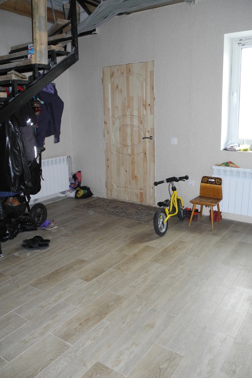 И, да, ещё забыла сказать, что будет обшиваться деревом лестница ( на фото ниже видно её кусочек, пока черновой вариант). Ступени хочу сделать тем цветом, которым будут двери для завершённости стиля. Или не стОит? Или их надо в цвет пола? В общем запуталась....