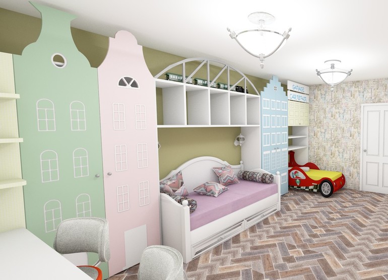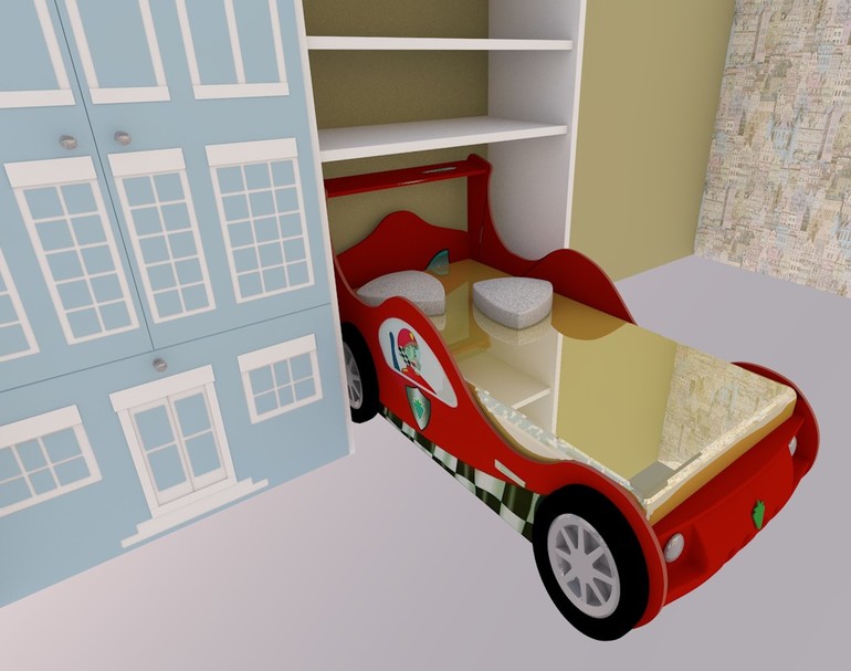 Недавно я выкладывала здесь детскую для троих деток с кроватью-машиной как раз.) Первоначально я не меняла цвета в модели кровати-машины, а она была именно красная)). Сохранились некоторые фрагменты: