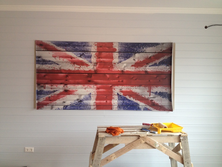 А флаг это лист гипсокартона, на него фотообои приклеены. Вот в процессе поклейки