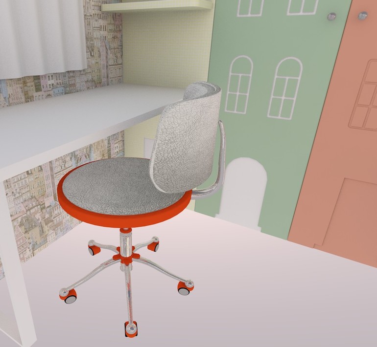 Я бы пол графитовый сделала, а-ля асфальт; одну стену под меловую доску, остальные белые/светлые, мебель тоже белую/светлую, чтоб со стенами сливалась