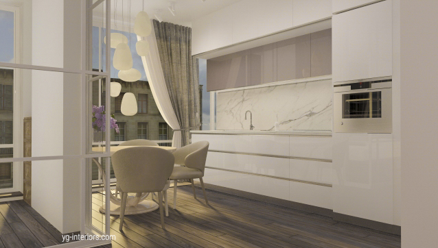 Этот вариант мне нравился тем, что напротив окна стоит два кресла и журнальный столик и можно попить кофе с видом на город! Окна на кухне в пол!