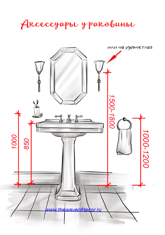 Интерьерное решение ванной комнатыДевушки, опять к вам с вопросами. Скажите пожалуйста, на каком расстоянии от зеркала вешаются подвесы в ванной комнате, и какое расстояние от пола?