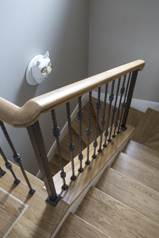 т.к. наша семья находится в самом начале пути к ремонту небольшого частного дома, поэтому скорее всего я тут стану частым гостем))). Но поскольку планировать нужно загодя, то прошу поделиться идеями оформления лестничного пролета забежной лестницы по форме буквой "Г". Очень смущает большое расстояние между лестничным маршем и стеной. Хотелось бы уйти от традиционных балясин и перил. Поскольку гостями будут дети знакомых, то парапет (если я правильно объясняю) на втором этаже малореализуем, т.к. можно перевалиться и слететь вниз на первый этаж. Может вместо него стеллаж, но тогда как установить перила? Нравится вот такое оформление лестницы